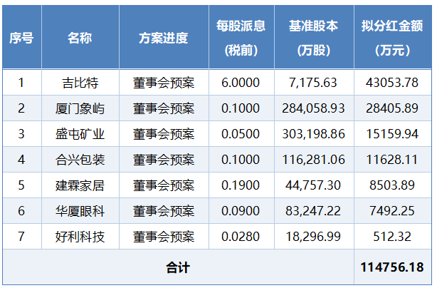 截至目前,辖区共有7家上市公司披露2025年第三季度利润分配方案,分红总额预计达11.48亿元。