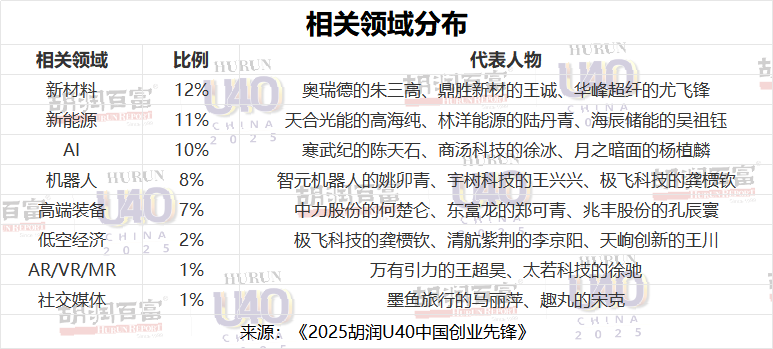 上榜U40创业先锋中,涉及新材料领域的占比12%,新能源11%,AI领域10%,机器人8%,高端装备7%,低空经济2%,AR/VR/MR和社交媒体均占1%。