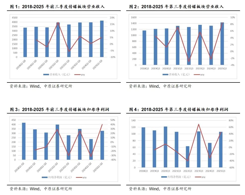 根据Wind统计(均采用加总值或加总平均值),2025年前三季度传媒板块140家上市公司总体营业收入为4160.65亿元,同比增加4.98%,归母净利润328.91亿元,同比增加40.23%,扣非后归母净利润273.98亿元,同比增加36.13%。