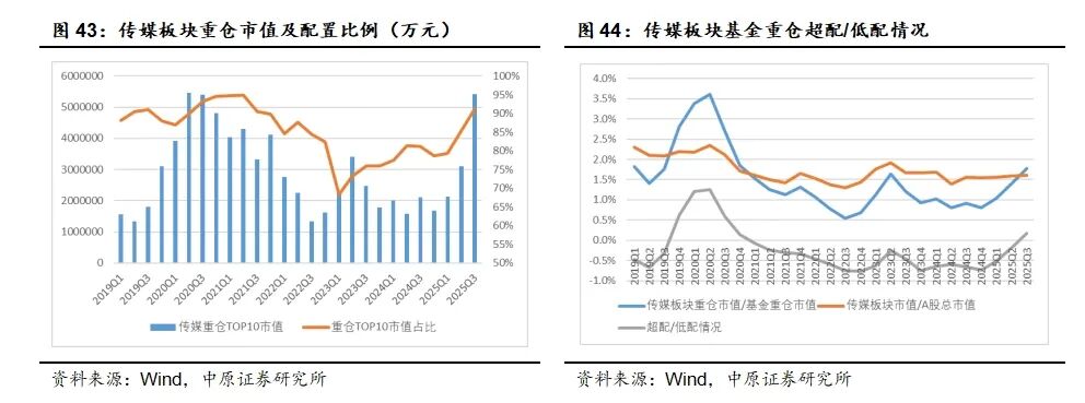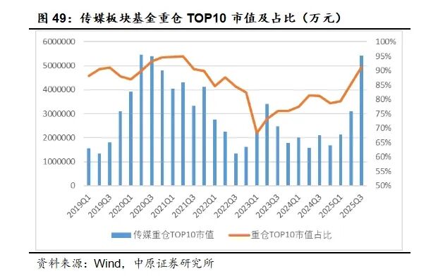 从前十大重仓股的重仓市值来看,基金对于传媒板块的重仓集中度较高,更青睐头部企业。2025Q3传媒板块重仓股市值TOP10的公司合计重仓市值为541.46亿元,环比提升231.29亿元,重仓市值达到2020Q3以来最高水平;TOP10重仓市值占传媒重仓股总市值的91.16%,集中度环比提升5.81pct,达到2021Q3以来单季度最高水平。