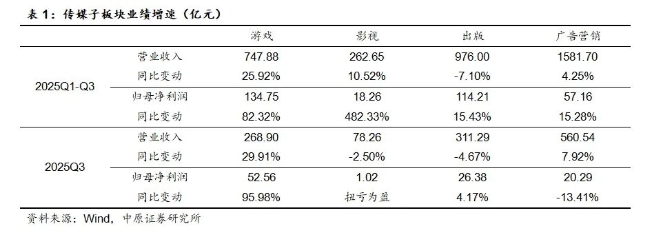 传媒板块2025年前三季度以及第三季度业绩表现优异,营收规模创新高,利润同比增幅超40%。子板块中游戏板块的市场景气度高,基本面优异,多家游戏公司新品市场表现好,对于传媒整体业绩增长的推动力强;影视板块Q3业绩也随暑期档票房回升呈现回暖;出版板块短期营收和营业利润承压,整体利润增长依赖所得税政策影响,但由于整体估值较低叠加具备高股息的特征,依然具有防御性价值;广告营销板块头部公司业绩增长稳健,盈利能力提升。