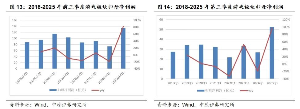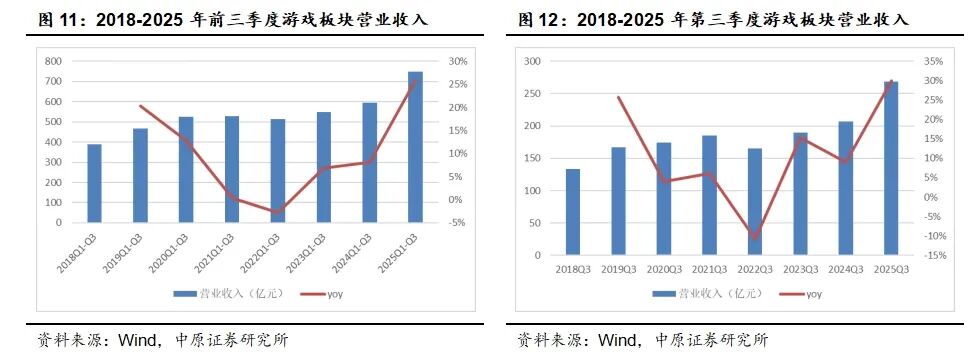游戏板块2025年前三季度营业收入747.88亿元,同比增加25.92%,归母净利润134.75亿元,同比增加82.32%;2025Q3营业收入268.90亿元,同比增加29.91%,归母净利润52.56亿元,同比增加95.98%。