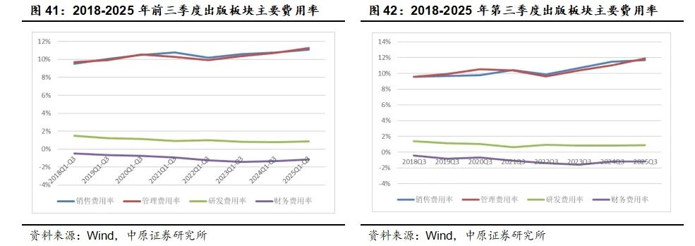 2025年前三季度出版板块毛利率33.79%,同比提升0.19pct,第三季度毛利率31.66%,同比提升0.80pct。前三季度销售费用率、管理费用率、研发费用率、财务费用率分别为11.10%、11.26%、0.87%、-1.17%,同比分别提升0.34pct、0.53pct、0.11pct、0.16pct;第三季度销售费用率、管理费用率、研发费用率、财务费用率分别为11.67%、11.90%、0.88%、1.20%,同比分别变动0.17pct、0.88pct、0.07pct、-0.04pct。