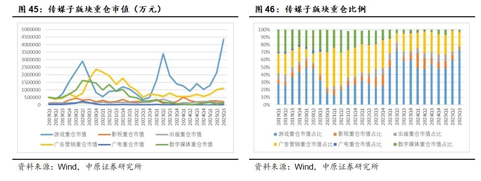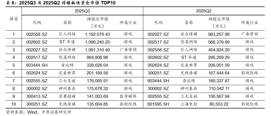 从2025Q3公募基金在传媒子板块的重仓配置来看,重仓市值排名前三的板块分别是游戏、广告营销和影视。