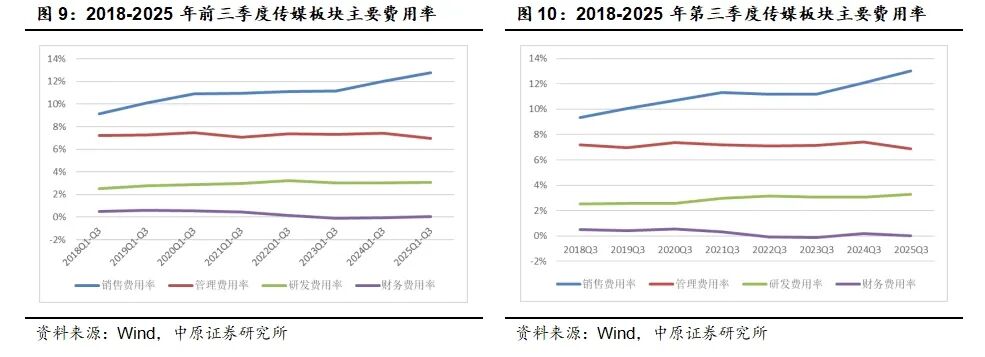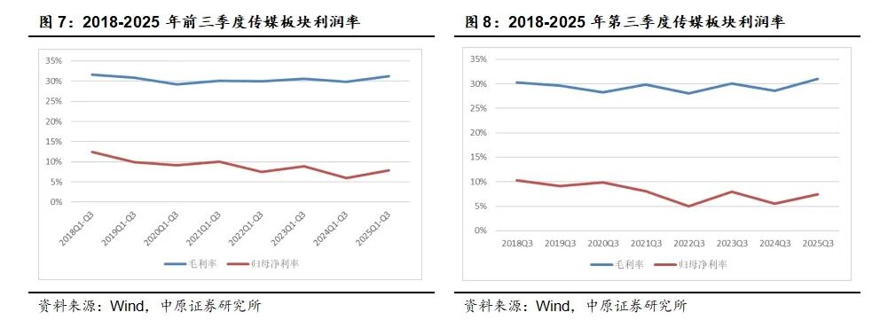 在盈利能力方面,2025年前三季度传媒板块的整体毛利率31.27%,同比提升1.42pct,归母净利率7.91%,同比提升1.99pct;2025Q3单季度整体毛利率31.05%,同比提升2.50pct,归母净利率7.42%,同比提升1.87pct。整体的盈利能力有所提升。