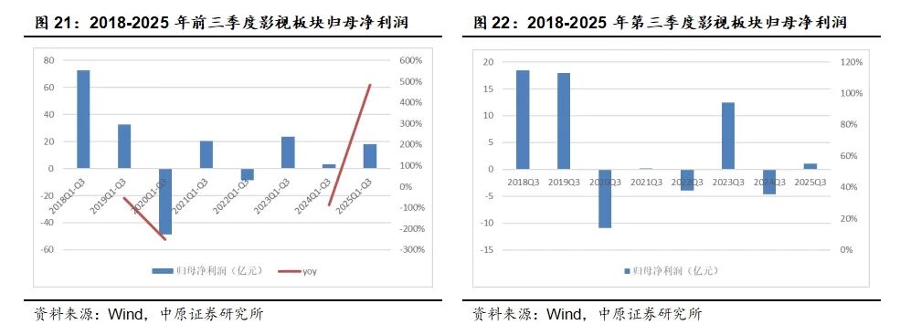 影视板块18家公司2025年前三季度营业收入262.65亿元,同比增加10.52%,归母净利润18.26亿元,同比增加482.33%;2025Q3营业收入78.26亿元,同比减少2.50%,归母净利润由2024Q3的-4.00亿元转为盈利1.02亿元。