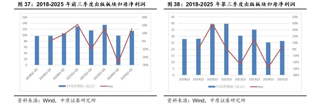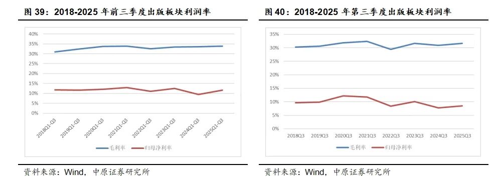 虽然出版板块的总体毛利率和各项费用率均有不同程度的提升,并且费用率的提升幅度略高于毛利率的提升幅度,但由于存在所得税的影响,出版板块的归母净利率仍有提升,2025年前三季度的归母净利率为11.70%,同比提升2.28pct,第三季度的归母净利率8.47%,同比提升0.72pct。