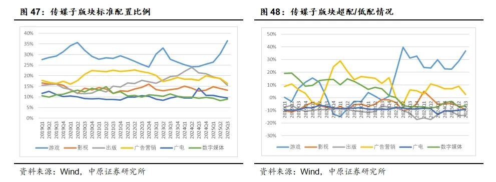 以传媒板块整体市值作为分母、各子板块的市值作为分子计算传媒子板块的配置标准,可以观察到2024年以来,对传媒重仓的基金中,游戏、广告营销两个子板块更受青睐,处于相对超配状态。其中2025Q3游戏的市值占比为36.53%,公募基金重仓配置比例为73.32%,超配比例高达36.79%,超配比例环比2025Q2进一步提升了7.97pct,超配力度达到2019年以来单季度第二,仅次于2023Q1的39.78%。