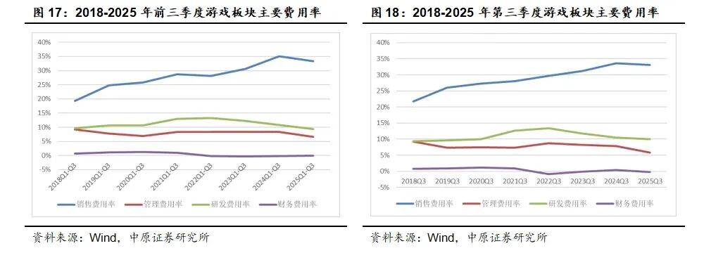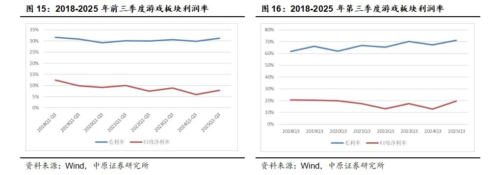 2025年前三季度板块的毛利率由上年同期的67.95%提升1.46pct至69.41%,第三季度毛利率由2024Q3的67.21%提升3.91pct至71.13%,随着游戏公司对低分成、高毛利的官服渠道以及第三方渠道的发力,整体的毛利率也有所提升。