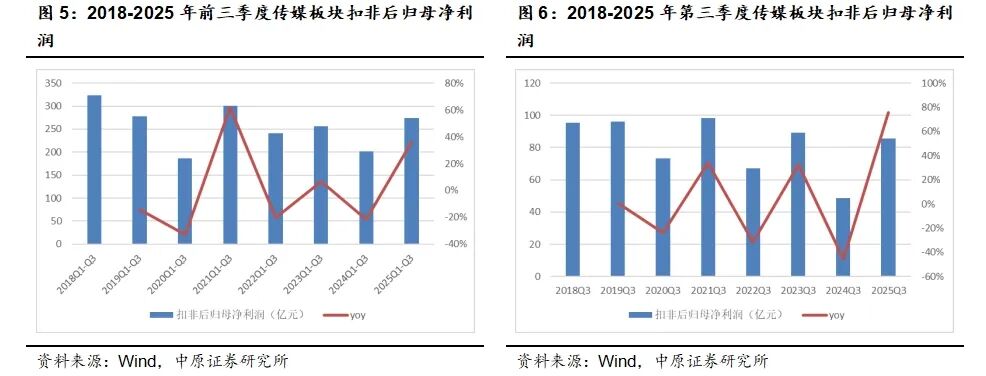 三季度营收创新高,利润大幅回升。2025年前三季度传媒板块总体营业收入为4160.65亿元,同比增加4.98%,归母净利润328.91亿元,同比增加40.23%。其中Q3单季度营业收入1431.78亿元,同比增加8.41%,归母净利润106.17亿元,同比增加44.74%。在营业收入端,2025年前三季度以及2025Q3均达到历年同期最高水平;归母净利润以及扣非后归母净利润端相比2024年同期有较大幅度的回升。