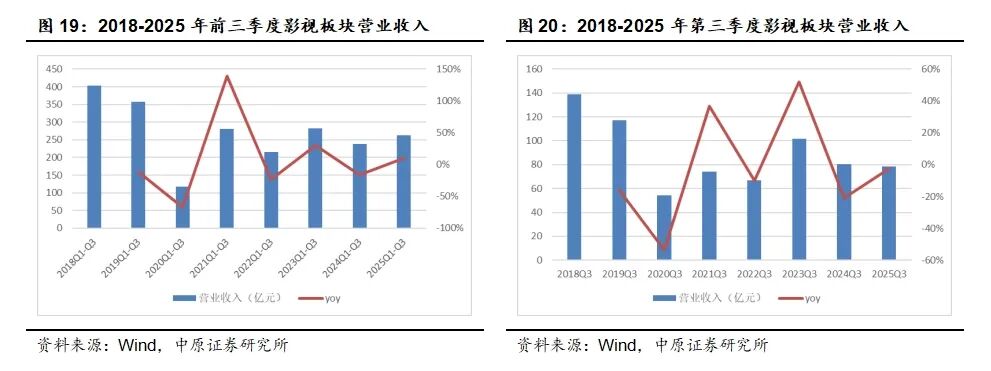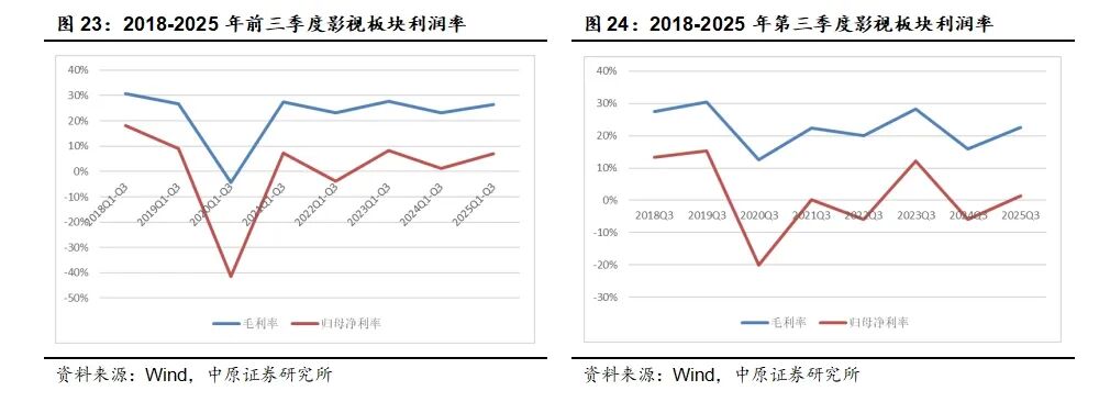 毛利率的提升加上费用率的下滑,影视板块前三季度的归母净利率同比提升5.63pct至6.95%,第三季度归母净利率提升7.13pct至1.31%。