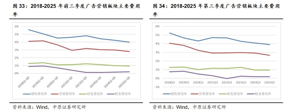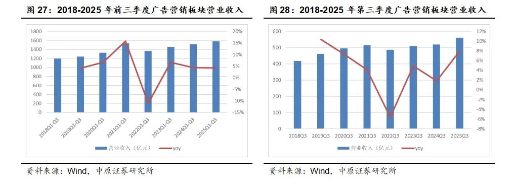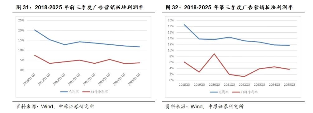 2025年前三季度广告营销板块毛利率11.74%,同比下滑0.44pct,第三季度毛利率11.71%,同比下滑0.10pct。虽然广告营销板块整体的收入实现增长并创新高,但市场竞争压力下广告营销公司的毛利率面临增长瓶颈,呈现出持续下滑的态势。