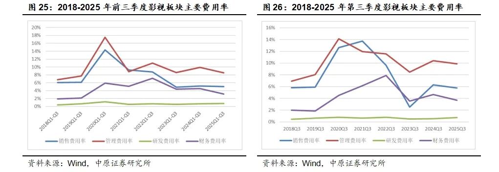 2025年前三季度影视板块毛利率26.57%,同比提升3.36pct,第三季度毛利率22.49%,同比提升6.61pct。同时整体费用率也有下滑,2025年前三季度的销售费用率、管理费用率、研发费用率、财务费用率分别为5.07%、8.55%、0.75%、3.15%,同比分别变动-0.08pct、-1.31pct、+0.07pct、-1.37pct;第三季度的销售费用率、管理费用率、研发费用率、财务费用率分别为5.77%、9.86%、0.74%、3.71%,同比分别变动-0.54cpt、-0.53pct、+0.18pct、-0.94pct。