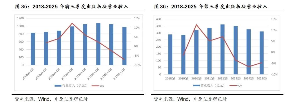 出版板块31家公司2025年前三季度营业收入976.00亿元,同比减少7.10%,归母净利润114.21亿元,同比增加15.43%;第三季度营业收入311.29亿元,同比减少4.67%,归母净利润26.38亿元,同比增加4.17%。
