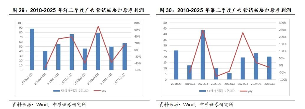 广告营销板块38家公司2025年前三季度营业收入1581.70亿元,同比增加4.25%,归母净利润57.16亿元,同比增加15.28%;第三季度营业收入560.54亿元,同比增加7.92%,归母净利润20.29亿元,同比减少13.41%。收入端达到历年同期新高。