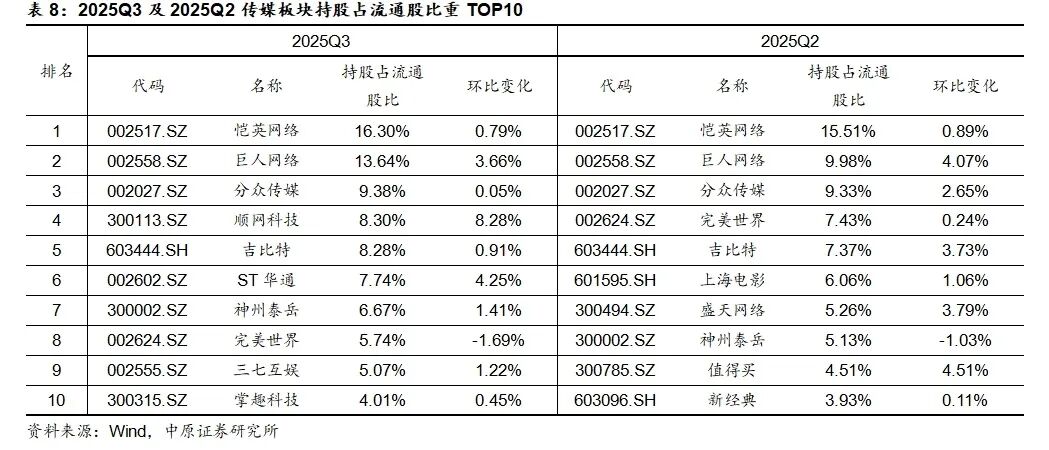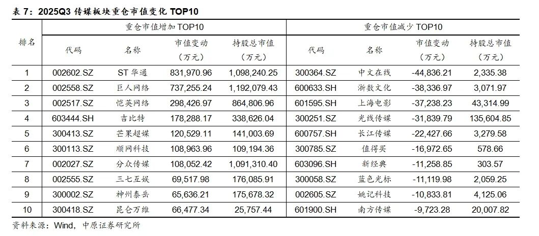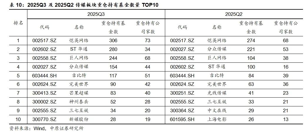 从基金重仓持股变化情况来看,2025Q3公募基金对传媒板块有明显的加配,持仓规模以及配置比例都达到近5年新高。从加仓情况来看,具有业绩增长优势、景气度高的公司和板块更受关注。