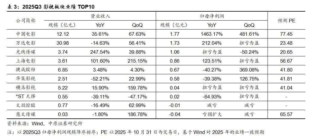 从影视板块头部企业的变化来看,2025Q3,中国电影在收入和利润端都实现了同比与环比的大幅提升,利润同比增长达1463.17%,环比增长达481.61%,增长主要来自于主投主控的《南京照相馆》以及其他主投或参投影片的上映,但前三季度公司的整体业绩承压,归母净利润同比减少69.22%;其他公司中,万达电影、上海电影、横店影视2025Q3利润端同比环比均有明显增长,2025年前三季度利润也有不同程度增加。