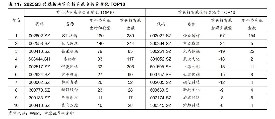 从重仓持有的基金产品数量变化来看,2025Q3重仓持有基金数量增长最多的10家公司分别是ST华通、巨人网络、芒果超媒、吉比特、恺英网络、完美世界、神州泰岳、新媒股份、华策影视、昆仑万维;减少数量最多的10家公司分别是分众传媒、中文在线、光线传媒、果麦文化、上海电影、长江传媒、姚记科技、浙数文化、游族网络、掌趣科技。