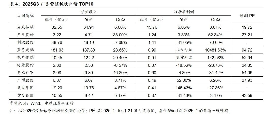 从广告营销板块头部企业的变化来看,2025Q3,分众传媒、兰生股份、蓝色光标、电广传媒、广博股份都在收入和利润端实现了同比环比的双增长。其中梯媒领域头部公司分众传媒前三季度的业绩增长稳健,毛利率持续提升并达到近年来新高;利欧股份前三季度实现较大幅度的扭亏为盈。