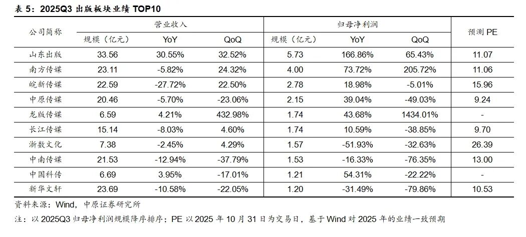 从出版板块头部企业的业绩变化来看,2025Q3,山东出版、龙版传媒在收入端和利润端实现了同比环比双增长,南方传媒利润端同比环比增长显著。出版板块头部公司的整体估值水平较低,国有出版公司的PE大约在10-15倍左右,具有低估值、高股息的特征。