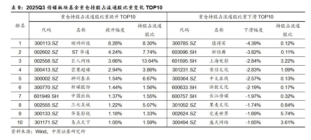 传媒板块基金重仓持股占流通股比重提升幅度TOP10的公司分别是顺网科技、ST华通、巨人网络、芒果超媒、神州泰岳、新媒股份、中国出版、三七互娱、华策影视、易点天下;下滑幅度TOP10的公司有值得买、新经典、上海电影、荣信文化、中文在线、浙数文化、长江传媒、果麦文化、完美世界、盛天网络。