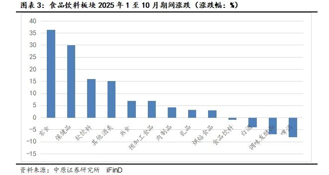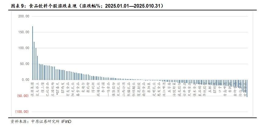 2025年1至10月,食饮个股的表现较上年改善,个股上涨比例过半,主要集中在零食、乳品、保健品和软饮料等板块。根据iFinD的数据,在128个上市公司中,录得上涨的个股有66个,个股的上涨比例达到51.56%。