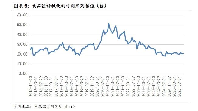 食饮板块估值处于十年历史的相对低位。根据iFinD的数据统计,截至2025年10月31日,食品饮料板块的估值20.06倍,环比上月降6.27%。就十年历史来看,食品饮料估值目前处于相对低位。其中,白酒低于食品饮料板块的整体估值。