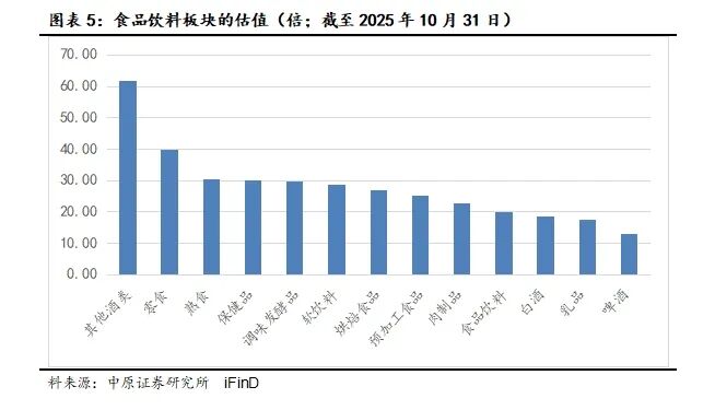 食饮板块估值处于十年历史的相对低位。根据iFinD的数据统计,截至2025年10月31日,食品饮料板块的估值20.06倍,环比上月降6.27%。就十年历史来看,食品饮料估值目前处于相对低位。其中,白酒低于食品饮料板块的整体估值:截至10月31日,白酒估值为18.68倍,低于食品饮料的整体估值。然而,保健品、其它酒、熟食、零食、软饮料、烘焙、预制食品等新兴食饮消费的估值仍较高,截至本期末分别为30.12、61.72、30.48、39.89、28.66、26.73和25.18倍。