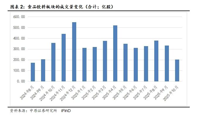 本期,食品饮料板块录得跌幅。酒水板块的表现对整体拖累较大,预制食品、保健品、烘焙等食品板块上涨。2025年10月,食品饮料板块成分区间涨跌幅为-0.58%,白酒、啤酒、软饮料、调味品等下跌,对板块的整体表现形成拖累。10月,食品饮料板块的成交量合计203.52亿股,环比9月减少130.34亿股,成交量环比大幅回落,较4月成交量高点减少318.71亿股。