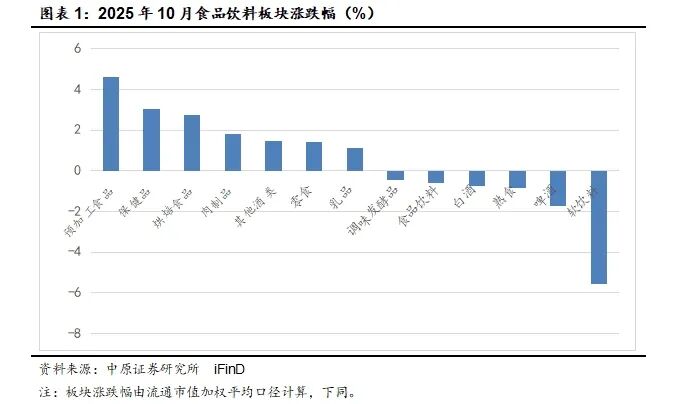 2025年10月,上涨的子板块包括预制食品、保健品、烘焙食品、肉制品、其它酒类、零食和乳品,分别上涨4.61%、3.03%、2.76%、1.79%、1.46%、1.42%和1.11%,其中预制食品反弹有力并表现强势。