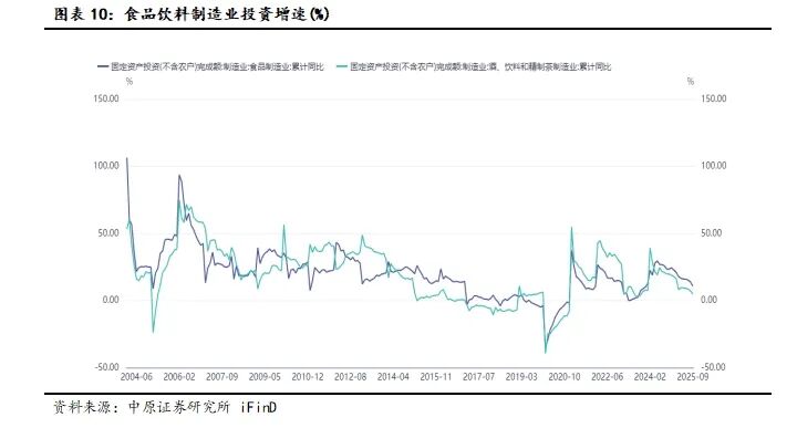2025年以来,食品饮料制造业的投资延续了上年较高增长水平,也远高于同期的社会投资增长水平。2025年9月,食品饮料投资增速环比回落。截至2025年9月,食品制造业的固定资产投资额累计同比增10.8%,酒、饮料和茶制造业的固定资产投资额累计同比增5%,增速均环比回落。同期,制造业固定资产投资额累计同比增4%。食品饮料制造业投资延续了上年的较高增长水平,也高于同期的制造业固定资产投资增长水平。