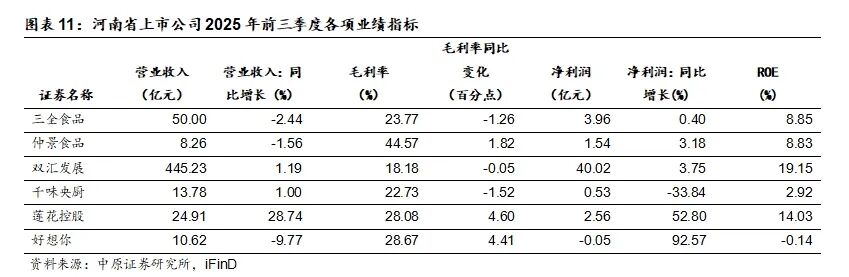 2025年前三季度,预制食品的毛利率普遍下滑,三全食品、千味央厨的当期毛利率分别同比下降1.26、1.52个百分点。此外,由于猪肉价格持续下跌,肉制品的毛利率也随之下滑:本期双汇发展的毛利率同比下降0.05个百分点。