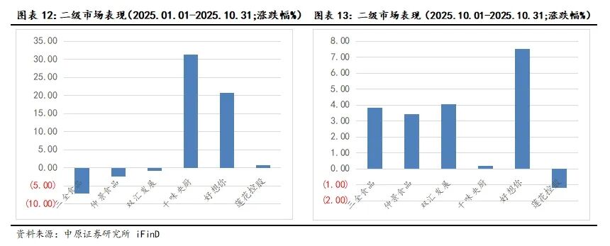 2025年1至10月期间:千味央厨和好想你的市场表现相对较好,股价累计上涨31.36%和20.77%。此外,三全食品和仲景食品期间下跌,累计跌幅7%和2.34%。
