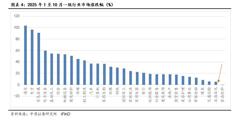 2025年1至10月,31个一级行业中30个行业上涨,1个行业下跌。其中,食品饮料是唯一下跌的一级行业,市场表现位于全行业倒数第一,亦位于消费行业中的末位。