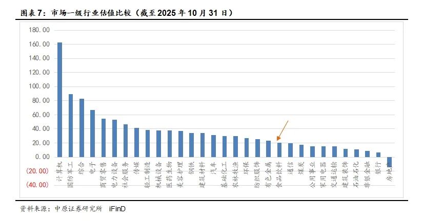 截至10月31日,在31个一级行业中,食品饮料板块的估值低于20个行业,高于10个行业,在一级行业估值排名中位居后位。在消费类一级行业中,本期食品饮料的估值位居倒数第二,高于家用电器的同期估值。