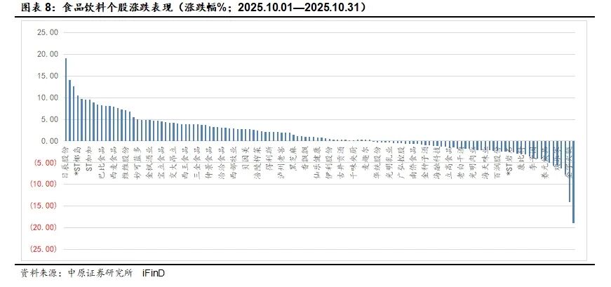 2025年10月,个股上涨比例达到60.16%,下跌比例39.84%,个股行情好于板块整体。其中,复合调味品、乳品、保健品、预制食品的个股表现相对较好,白酒的部分个股表现优于白酒整体。