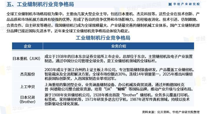 全球工业缝制机市场格局较为集中,主要由几家大型企业主导,包括日本重机、杰克科技等,这些企业在技术创新、产品品质和市场拓展方面具有较强的优势,形成了各自的竞争优势和市场影响力。历经吸收消化、技术引进、仿制跟随、合资合作、自主研发等路径,我国缝纫机已成为全球规模最大、产业链最完善的缝制机械工业体系,国产工业缝制机部分品牌已接近国际先进水平,近年来全球工业缝纫机竞争格局总体较为稳定。