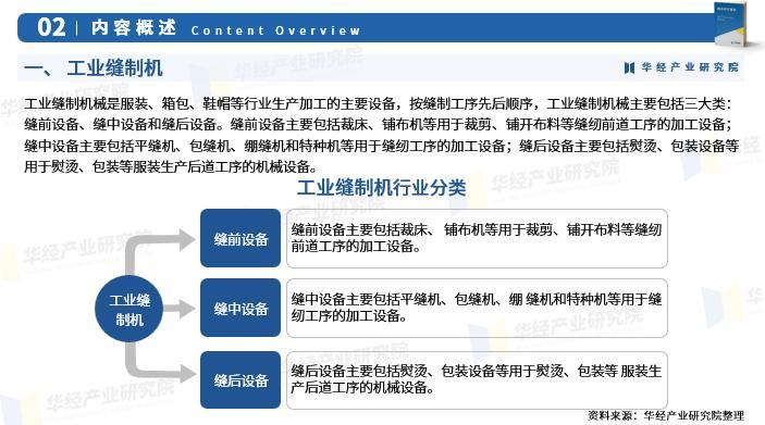 工业缝制机械是服装、箱包、鞋帽等行业生产加工的主要设备,按缝制工序先后顺序,工业缝制机械主要包括三大类:缝前设备、缝中设备和缝后设备。缝前设备主要包括裁床、铺布机等用于裁剪、铺开布料等缝纫前道工序的加工设备;缝中设备主要包括平缝机、包缝机、绷缝机和特种机等用于缝纫工序的加工设备;缝后设备主要包括熨烫、包装设备等用于熨烫、包装等服装生产后道工序的机械设备。