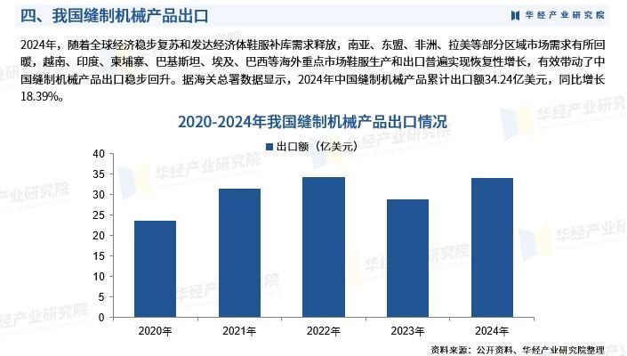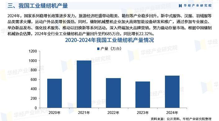 2024年,国家系列稳增长政策逐步发力,旅游经济旺盛带动鞋类、箱包等产业稳步回升。新中式服饰、汉服、羽绒服等品类需求火爆,运动户外品类增长强劲。同时,缝制机械整机企业加大高效智能设备研发和推广,通过参加专业展会、举办新品发布、强化技术服务、推动以旧换新等系列活动,深入终端加大品牌营销,努力撬动存量市场。根据中国缝制机械协会估算,2024年全行业工业缝纫机总产量回升至约685万台,同比增长22.32%。