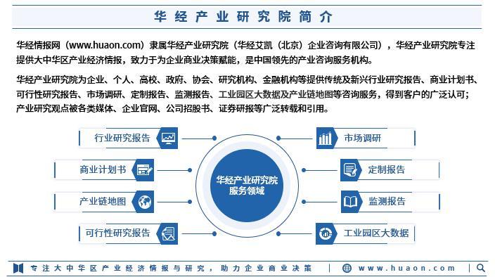 华经情报网隶属于华经产业研究院,专注大中华区产业经济情报及研究,目前主要提供的产品和服务包括传统及新兴行业研究、商业计划书、可行性研究、市场调研、专题报告、定制报告、工业园区大数据、产业链地图等。涵盖文化体育、物流旅游、健康养老、生物医药、能源化工、装备制造、汽车电子等领域,还深入研究智慧城市、智慧生活、智慧制造、新能源、新材料、新消费、新金融、人工智能、“互联网+”等新兴领域。