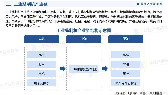 工业缝制机产业链上游涵盖钢材、铝材、电机、电子元件等原材料及缝纫机针、压脚、旋梭等精密零部件制造,涉及冶金、电子、精密加工等行业;中游为整机研发制造,包括工业平缝机、包缝机、特种机及智能裁床等设备,技术聚焦高速、高精度、自动化与物联网集成;下游连接服装、鞋帽、箱包、汽车内饰等终端应用领域,并通过经销商、电商平台及售后服务网络触达用户。
