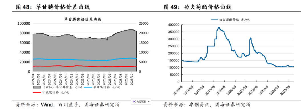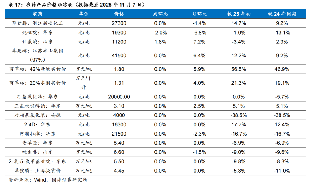 据Wind和百川盈孚,2025年11月7日功夫菊酯原药价格为10.9万元/吨,较10月31日上涨0.3万元/吨;联苯菊酯原药价格为12.9万元/吨,较10月31日上涨0.3万元/吨;草甘膦原药价格为2.73万元/吨,较10月31日持平。