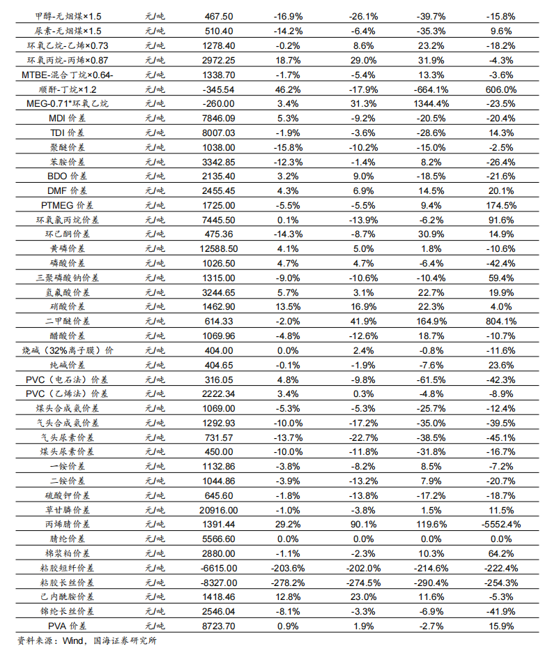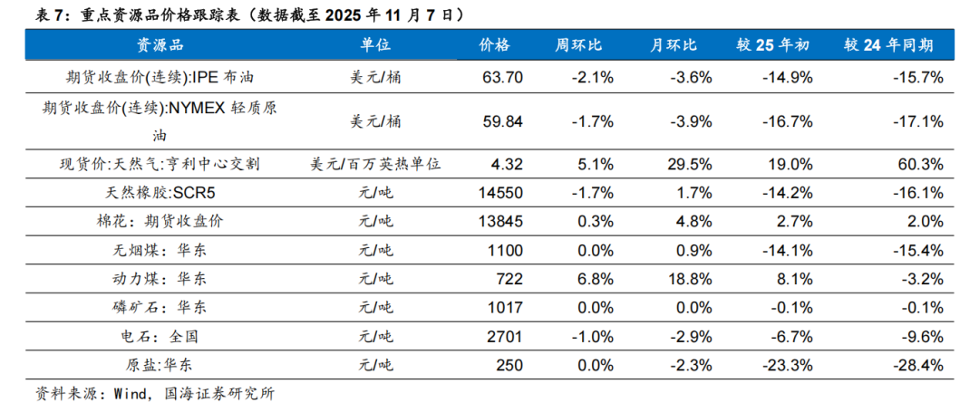 我们跟踪的171种产品的价格中,有31种上涨,占比18.13%,有65种产品下跌,占比38.01%。周涨幅前五的产品分别为:动力煤:华东(6.8%)、动力煤:华东(5.22%)、现货价:天然气:亨利中心交割(5.05%)、锂电池电解液:全国均价(4.35%)、DMC碳酸二甲酯(4.23%)。周跌幅前五的产品分别为:液氯:国内(-34%)、丁二烯:华东(-8%)、顺丁橡胶:齐鲁(-7.27%)、丁二烯:FOB韩国(-7.23%)、期货结算价(连续):沥青(-6.79%)。