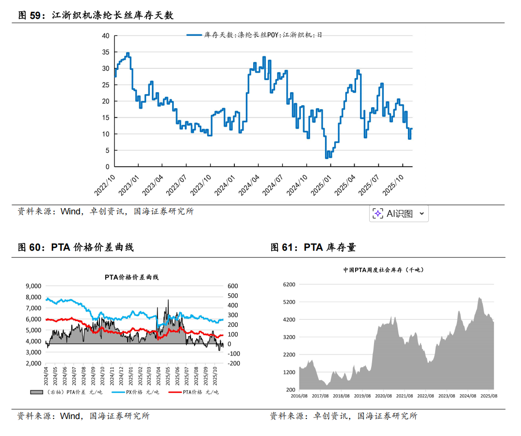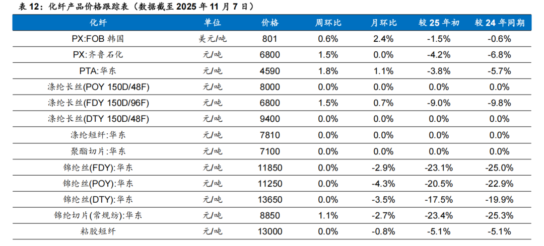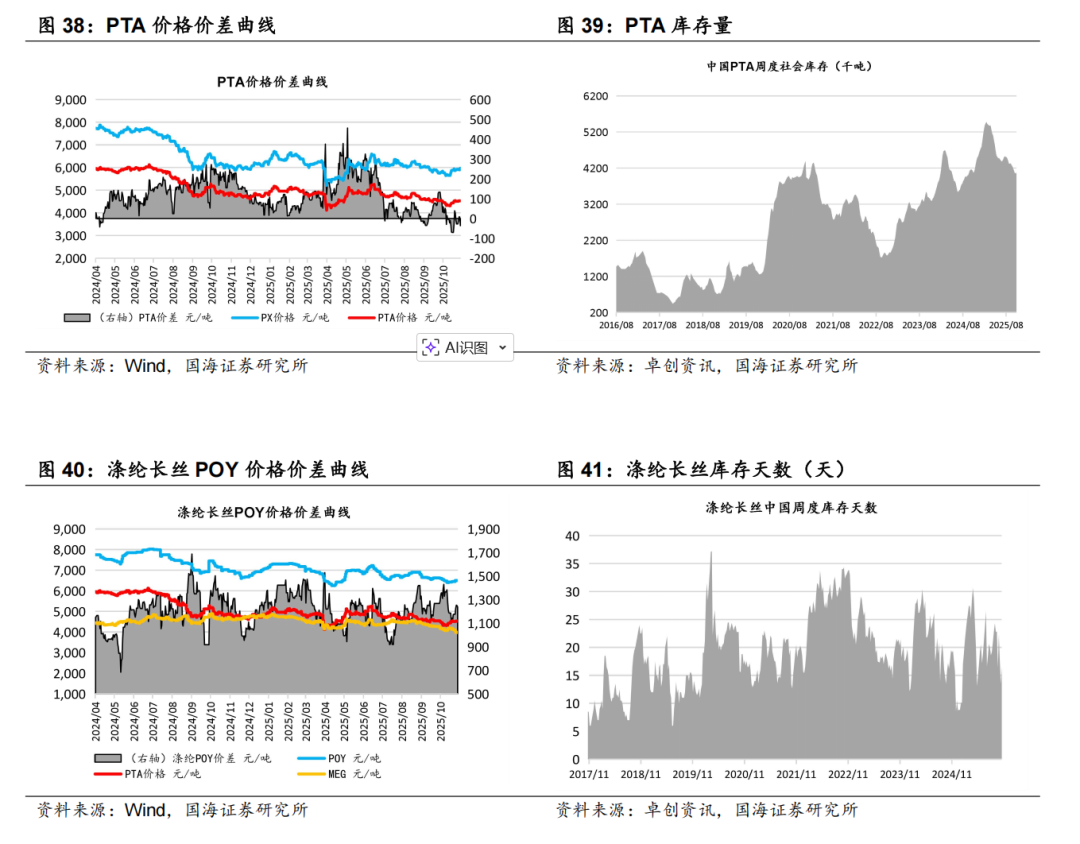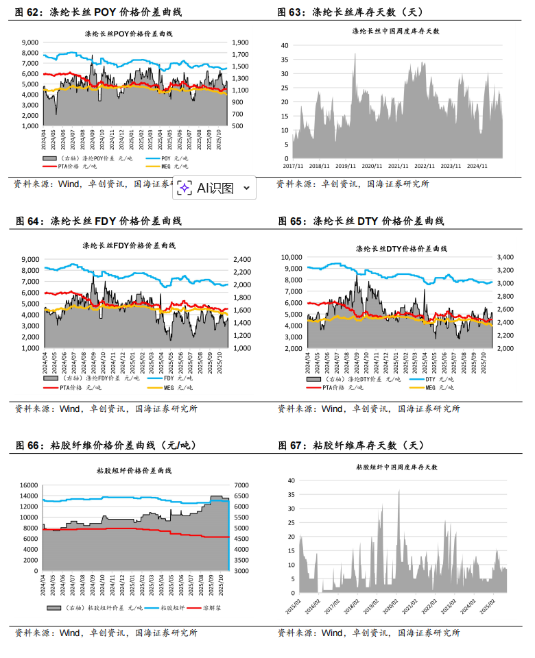 据Wind和卓创资讯,2025年11月7日,涤纶长丝库存天数为16.5天,较10月30日上涨3天。2025年11月7日,PTA库存为407.2万吨,较10月31日上涨1.7万吨。涤纶长丝POY价格为6550元/吨,较10月31日上涨100元/吨;PTA 价格为4570元/吨,较10月31日上涨60元/吨。