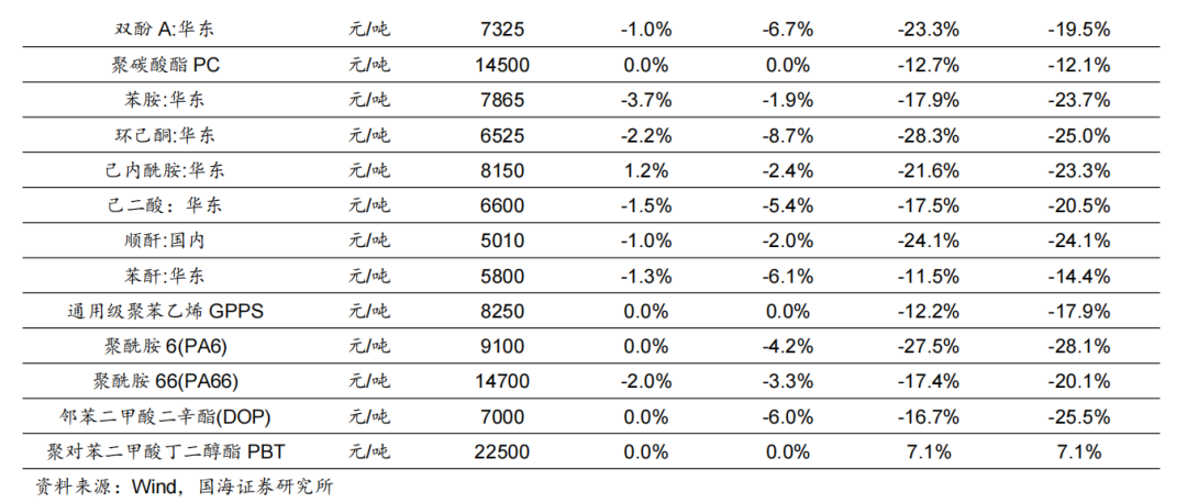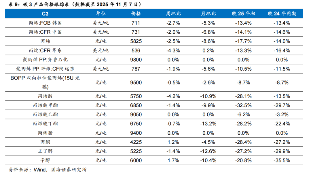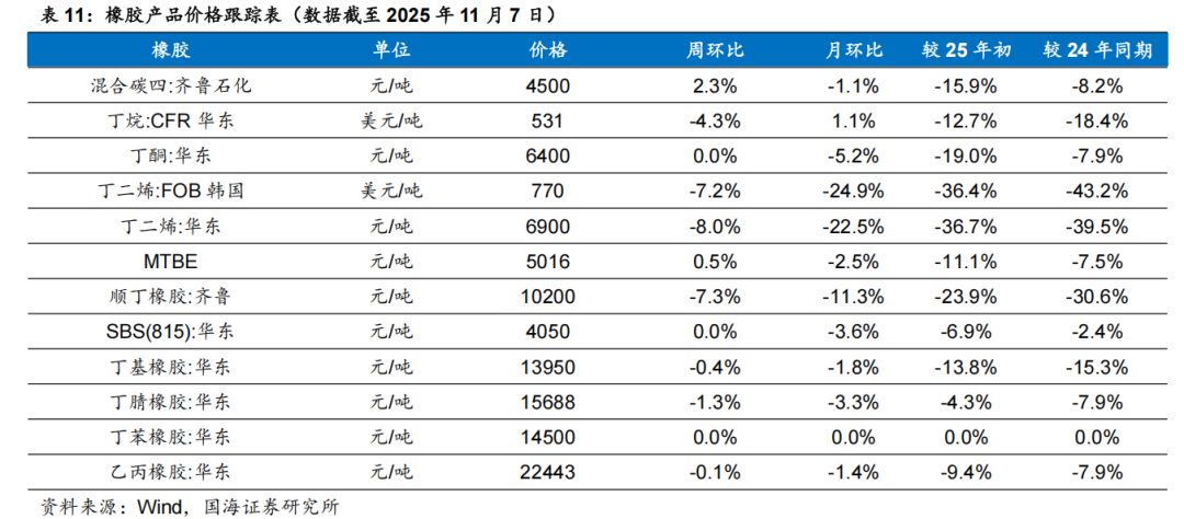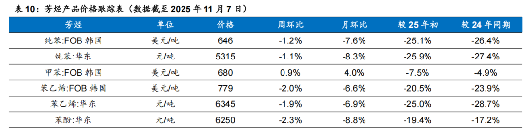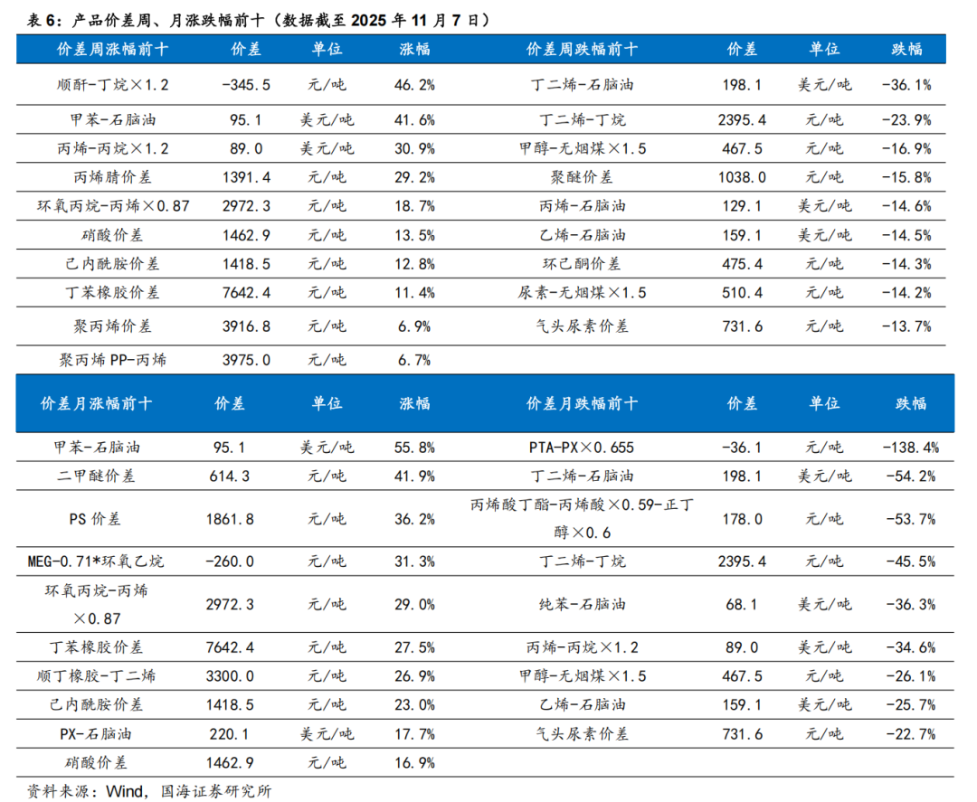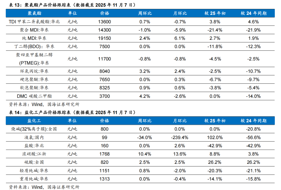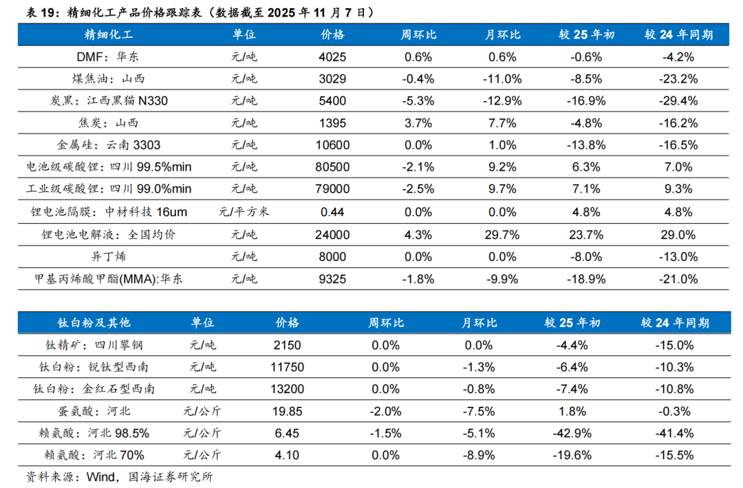 根据Wind,2025年11月6日顺酐价格为4850元/吨,环比10月31日下降170元/吨;据卓创资讯,2025年11月7日丁酮价格为6543元/吨,环比10月31日持平。