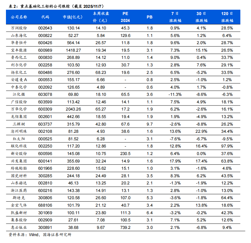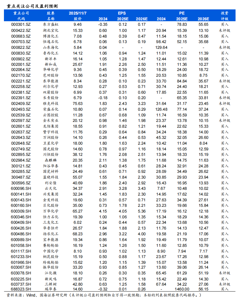 风险提示:宏观经济变化;油价震荡变化;环保趋严;产品价格大幅波动;重点关注公司业绩不达预期;中美财政政策不及预期;化工产品去库低于预期;AI数据中心建设和航空航天材料需求不及预期;全球经济增长的不确定性;磷矿石价格大幅下行;有机硅等行业原材料价格波动风险;反内卷政策不及预期的风险;关税贸易政策不确定性。