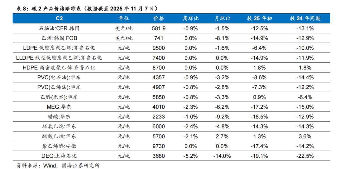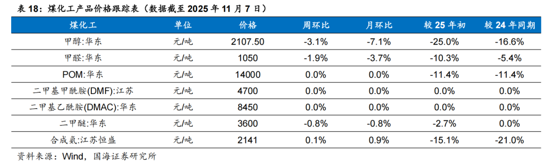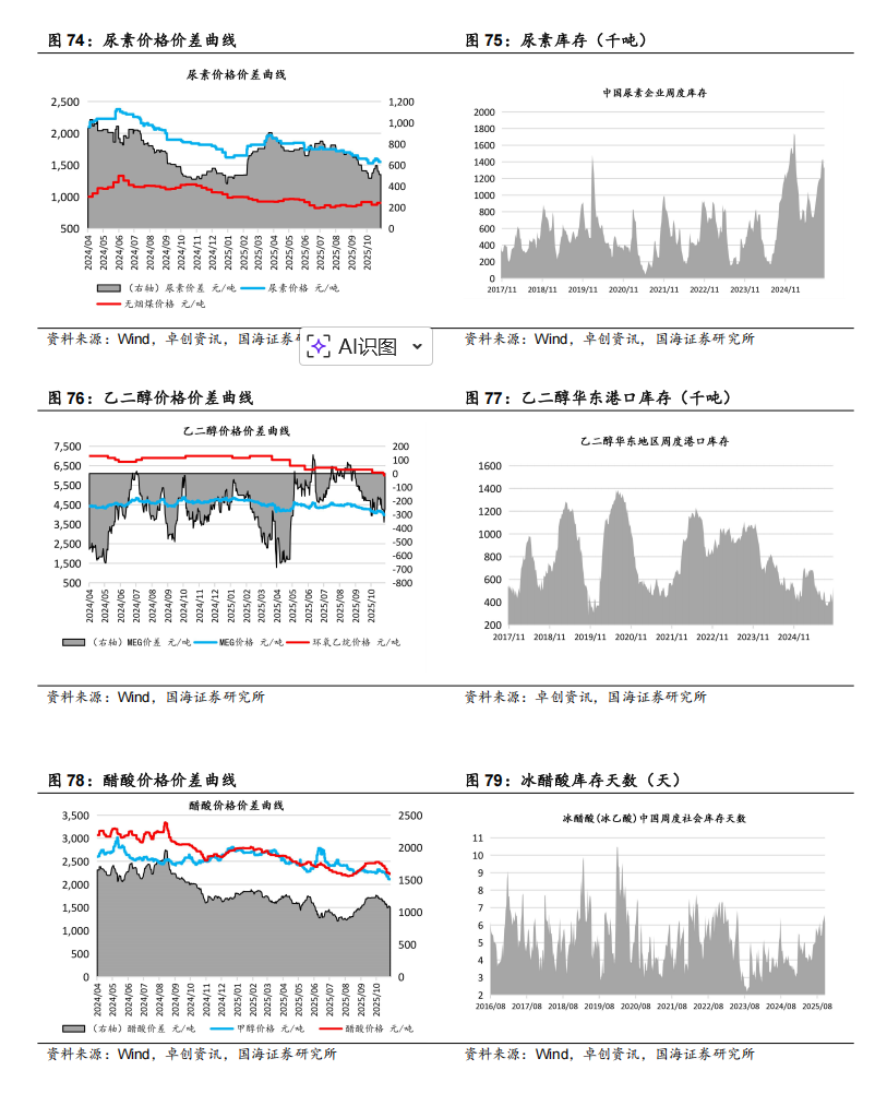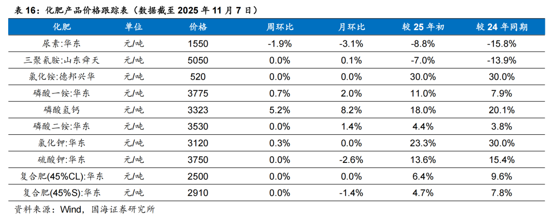据百川盈孚,2025年11月7日乙二醇价格为4053元/吨,环比10月31日下降86元/吨。据卓创资讯,2025年11月7日尿素小颗粒价格为1550元/吨,环比10月31日下降30元/吨。