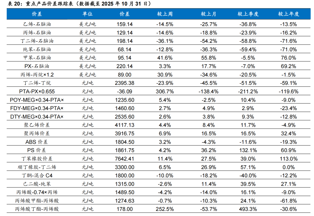本周(2025年11月31日-2025年11月7日,下同)国内动力煤市场价格持续上行,冬储需求预期较强,市场看涨情绪浓厚,下游买货情况尚可,加上铁路优惠政策恢复,站台及贸易商拉运积极性提升,市场交易活跃度较高,带动煤价走势上行。本周电解液价格上涨,六氟磷酸锂市场供应紧张状态持续,价格保持强势。经过前几个月的去库存周期,主流电池厂的库存水平已回归相对健康状态,采购需求正在逐步恢复。但采购策略普遍偏向谨慎,多以按需采购为主,大规模囤货现象少见。整体市场表现为“储能强、动力稳、电子弱”,整体需求在温和复苏。本周国内环氧丙烷价格重心较上周显著上移。周初工厂库存持续低位运行支撑挺价;周中供应端排货顺畅、下游原料库存偏低推动,价格加速上涨,出现超预期涨幅。本周丁二烯市场价格下跌。周内丁二烯市场暂无明显改善,内外盘市场行情双双走弱,消息面利空业者出货情绪,且下游合成橡胶市场行情同步走跌,产业链整体走势下滑,丁二烯市场行情弱势依旧,价格不断跌破新低。本周顺丁橡胶价格有明显下滑。周内中石油、中石化等主流销售公司两次下调供价,主要源于本周原料丁二烯有明显跌势,业者看空情绪较为突出,合成橡胶期货盘面亦有明显下跌,成本和期货走势影响下,主流厂家及民营企业价格不断走跌,现货市场围绕供价不断降价出货,然下游需求端低迷行情延续。本周炭黑市场延续下行走势。本周煤焦油、乙烯焦油、炭黑油市场重心小降,蒽油、脱固油浆市场窄幅波动。综合来看,炭黑成本端支撑偏弱。本周炭黑行业开工率降至64.74%,叠加前期库存积压尚未完全消化,行业供需宽松格局延续。炭黑企业为加速库存去化,多采取主动让利策略抢占刚需订单,市场价格竞争态势加剧。部分轮胎企业借助当前炭黑低价窗口启动批量补货,一定程度上缓解了炭黑企业的库存压力。但整体来看,终端市场需求复苏仍显乏力,供需端的阶段性矛盾尚未根本缓解,拖累炭黑市场价格持续走低。