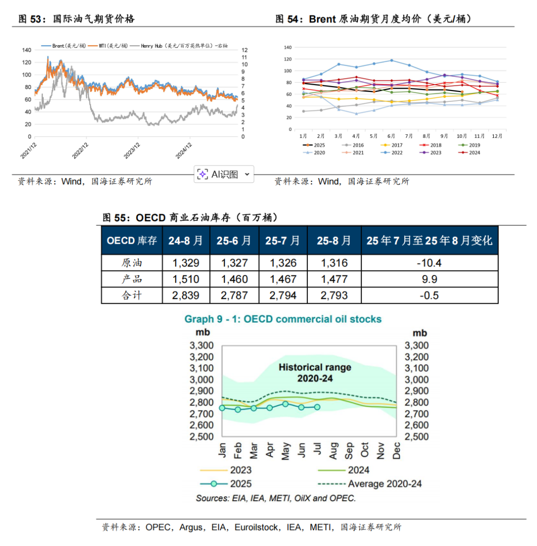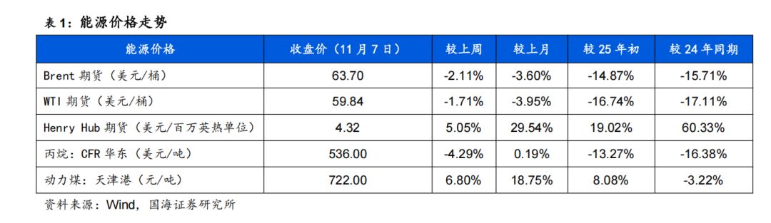 据Wind,截至本周,Brent和WTI期货价格分别收于63.7和59.84美元/桶,周环比-2.11%和-1.71%。