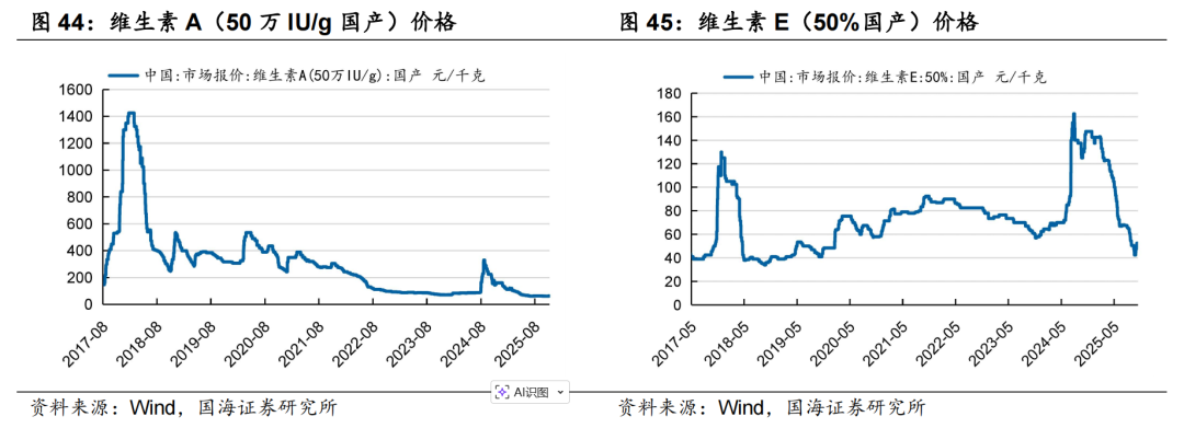 据Wind,2025年11月7日,维生素A价格为63.00元/千克,环比10月31日持平;维生素E价格为52.50元/千克,环比10月31日持平。
